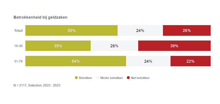 Wat de betrokkenheid betreft, voelt - jammer genoeg - slechts 50% van de Belgen zich betrokken bij hun geldzaken. Nog opvallender: bij jongeren onder de 30 zakt dit percentage naar 35%.