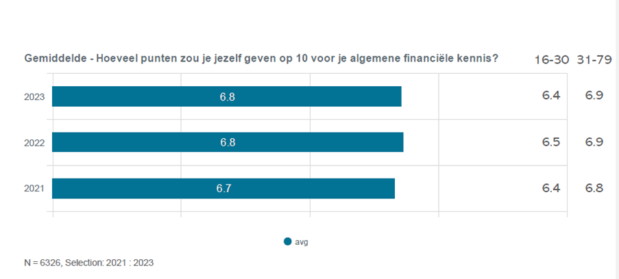 Globaal geven Belgen zichzelf een score van 6,8/10 wanneer gevraagd wordt naar hun financiële kennis. Voor zaken, zoals het opvolgen van dagelijkse financiële administratie, digitaal bankieren en contactloze betalingen, geeft men zich een goede score. Maar als we het hebben over lenen, beleggen, pensioensparen of cryptocurrencies, dan scoort men veel lager.