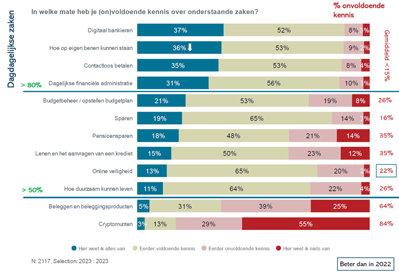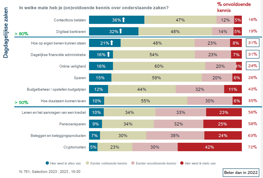 We vinden dat we voldoende kennis hebben over de dagdagelijkse zaken (op eigen benen staan, digitaal bankieren, contactloos betalen en opvolgen dagelijkse financiële administratie). De kennis is het laagst over cryptomunten en beleggen, gevolgd door lenen en pensioensparen.