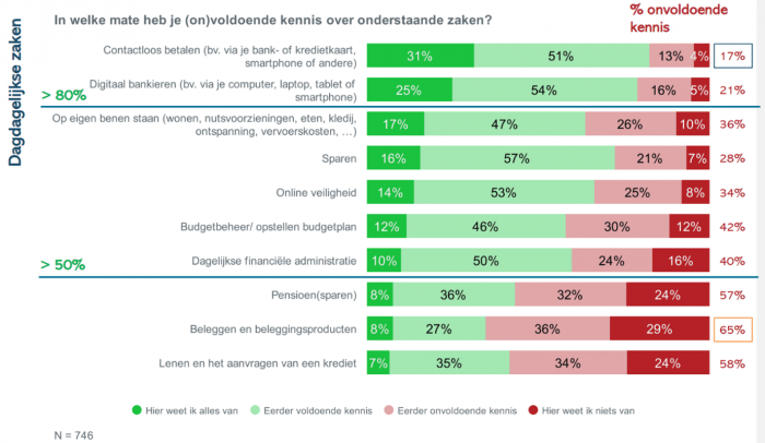 Terwijl de kennis over het beheer van dagelijkse financiële administratie, contactloos betalen, digitaal bankieren en op je eigen benen staan goed zijn, zijn de cijfers met betrekking tot kennis van de Belg over lenen, budgetbeheer en pensioensparen een stuk lager. Wat betreft kennis over beleggen en beleggingsproducten is de situatie zeker niet rooskleurig.