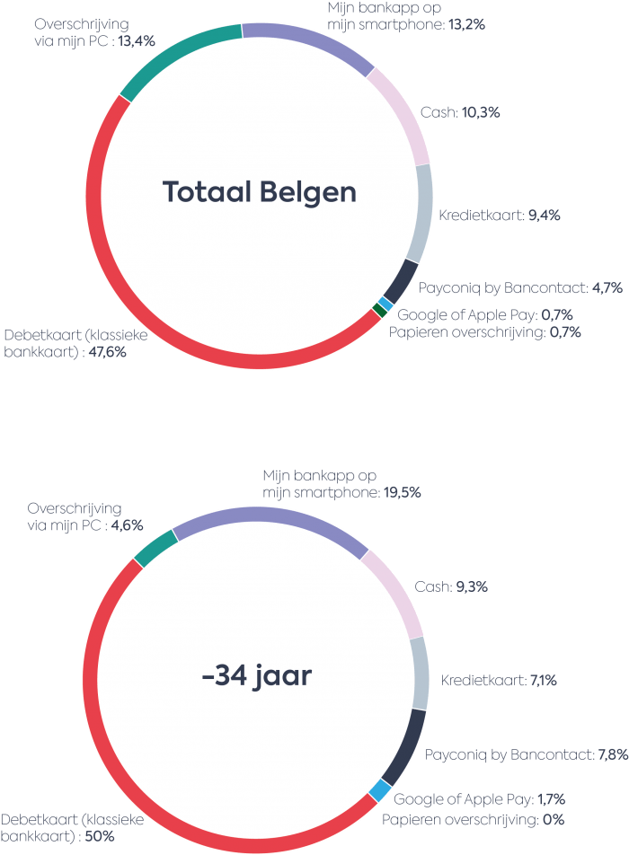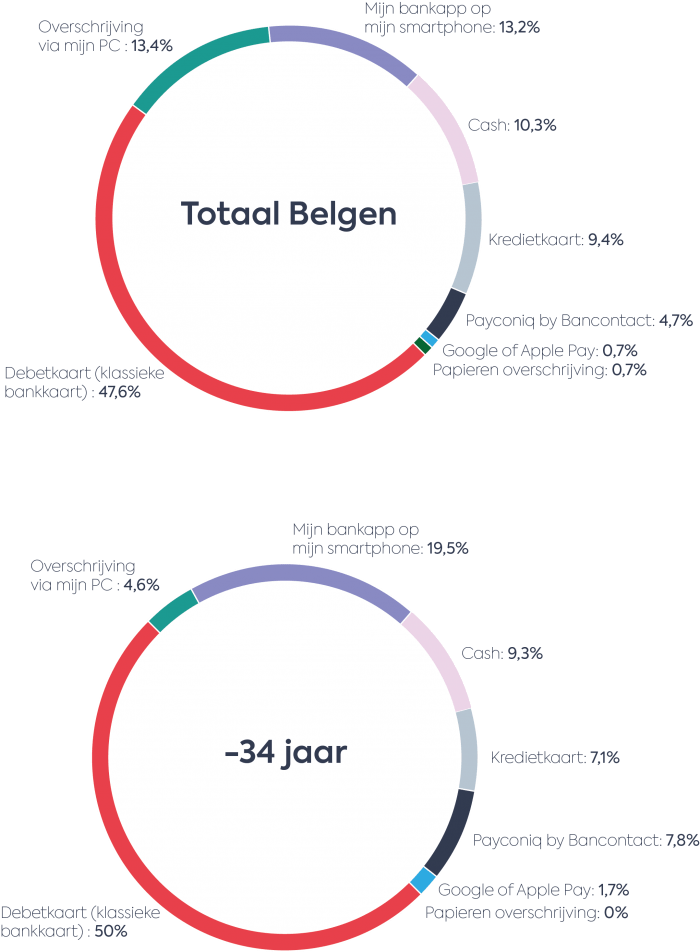 Bijna de helft van de Belgen betaalt het liefst met de debetkaart. Daarnaast verkiest zo’n 19% een betaalapp (bankapp, Payconiq by Bancontact, Google of Apple Pay) en 9,4% de kredietkaart. Bij jonge Belgen onder de 34 jaar zijn betaalapps nog populairder. Binnen deze doelgroep verkiest 29% een betaalapp als favoriete betaaloplossing. Mobiel betalen zit in de lift. Zo registreerde Bancontact Payconiq Company het afgelopen jaar 34 miljoen mobiele betalingen, een verdubbeling ten opzichte van 2017.