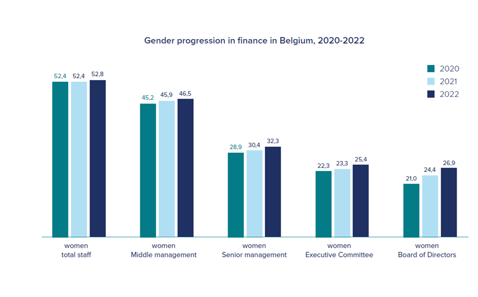 In 2022 zien we voor het eerst een positieve evolutie op gebied van gendergelijkheid in álle managementniveaus. Vrouwen vertegenwoordigen nu 46,5% van het middenmanagement (middenmanagers); 32,2% van het senior management (management), 25,4% van de uitvoerende comités en 26,9% van de raden van bestuur. Dat blijkt uit het nieuwe jaarverslag van Wo.Men in Finance Belgium. Daarin vind je ook een overzicht van alle initiatieven en een overzicht van de evolutie van diversiteit op alle niveaus in de financiële sector in 2022.