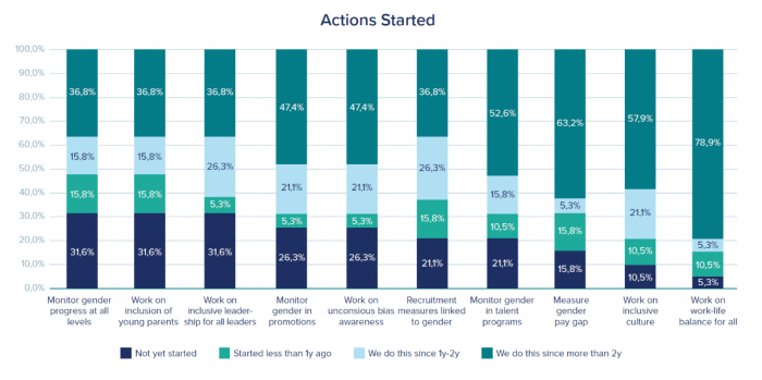 De grafiek hieronder toont aan dat de meerderheid van Wo.Men in Finance leden al één of twee jaar actief inzet op verschillende domeinen. In vergelijking met 2019 zetten ze vandaag meer in op het monitoren van de vooruitgang van gendergelijkheid op alle niveaus en op het werken aan inclusief leiderschap voor alle leiders.