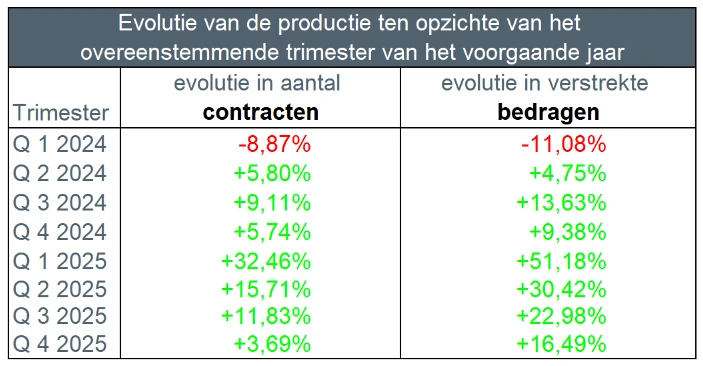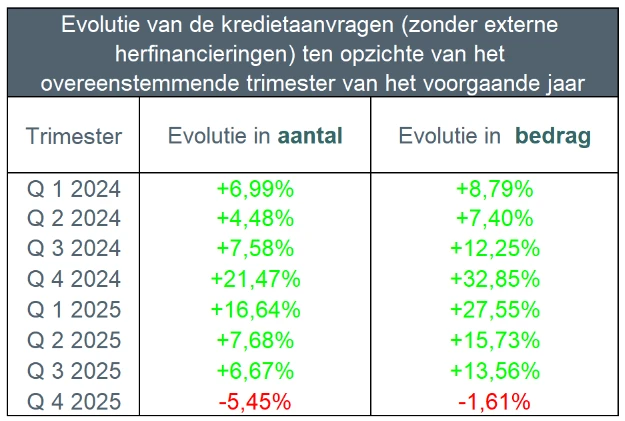 Vergeleken met het vierde kwartaal van 2024 was er in Q4 2025 een stijging van het aantal toegekende kredieten met +3,7% in aantal en bijna +16,5% in bedrag.