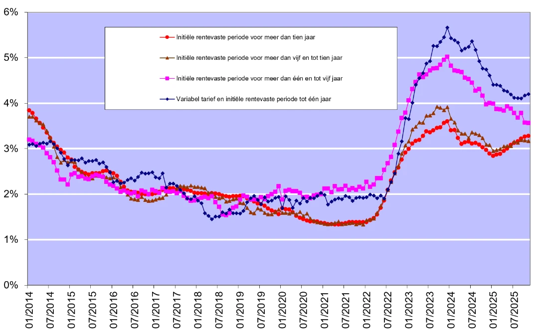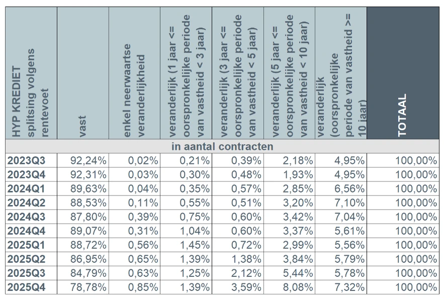 In het vierde kwartaal van 2025 kozen meer dan 8 van de 10 kredietnemers (86,1%) voor een vaste rentevoet of een veranderlijke rentevoet met een initiële rentevaste periode van minstens 10 jaar. Ongeveer 11,7% van de kredietnemers gaf de voorkeur aan een veranderlijke rentevoet met een initiële rentevaste periode tussen 3 en 10 jaar. Het aantal kredietnemers dat koos voor een jaarlijkse veranderlijke rentevoet bedroeg slechts tot 2,2%.