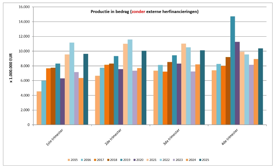 Het jaar 2025 was, net zoals 2024, positief voor de productie van nieuwe hypothecaire kredieten. De verlaging van de registratierechten in Wallonië en Vlaanderen heeft de activiteit op de vastgoedmarkt een duidelijke boost gegeven.