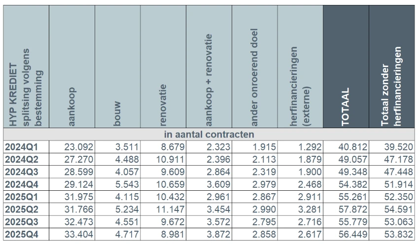 Het aantal kredietaanvragen voor de aankoop van een woning (-1.235) daalde met 2,6%, die voor renovatie (-2.031) met -15,4%, die voor de bouw van een woning (-543) met -7,5% en het aantal kredietaanvragen voor andere doeleinden (garage, bouwgrond, ...) (-761) met -15,1%. Het aantal externe herfinancieringen (-726) daalde met 16,6% in het laatste kwartaal van 2025. Het aantal kredietaanvragen voor aankoop + renovatie (+271, of +5,4%) vormt hierop een uitzondering.