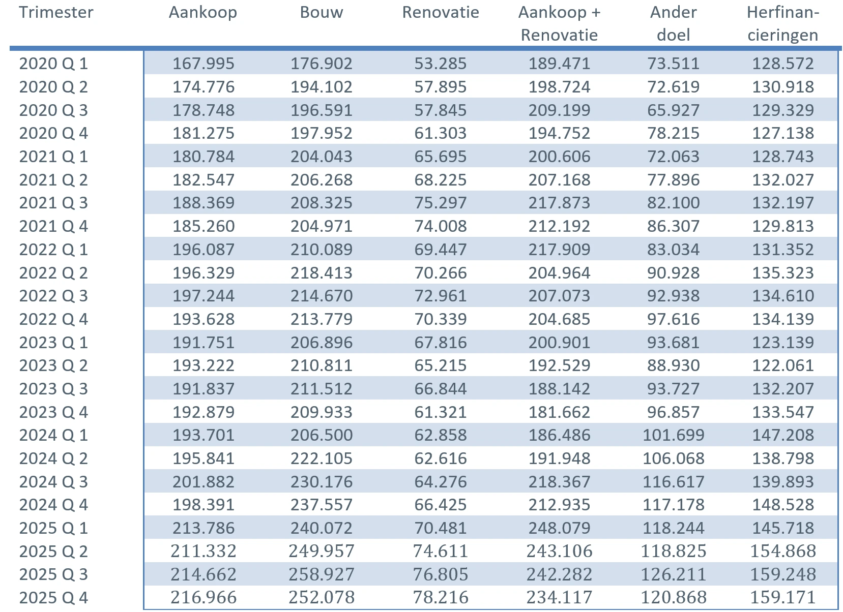 Het gemiddelde bedrag van een bouwkrediet steeg eind 2025 tot ongeveer 252.000 euro. Dit betekent een stijging van ongeveer 76.000 euro ten opzichte van eind 2019 en een stijging van 54.000 euro (+27,3%) ten opzichte van eind 2020.