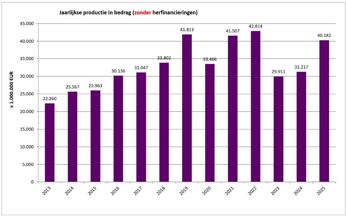 In 2025 werden bijna 214.000 kredieten, exclusief herfinancieringen, toegekend voor een bedrag van meer dan 40 miljard euro. Dit betekent een toename van bijna 15% in aantal en bijna 29% in bedrag ten opzichte van 2024.
