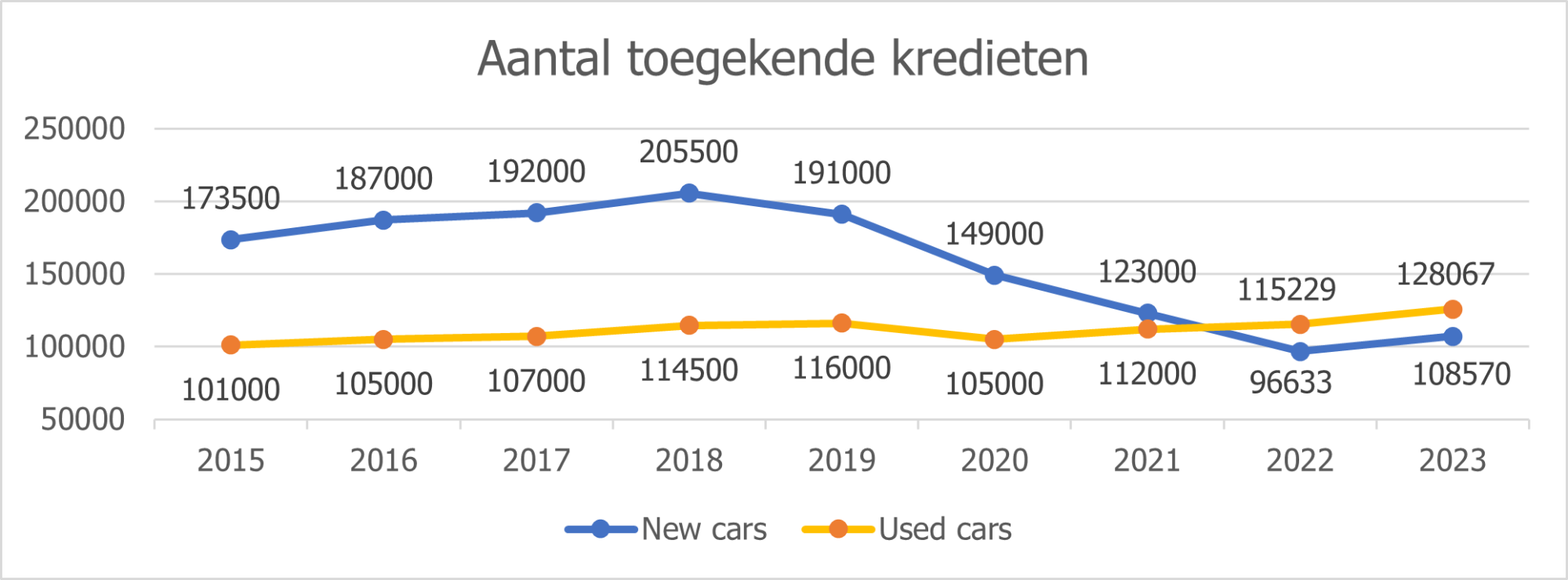 Het jaar 2023 kende een stijging van het aantal kredietovereenkomsten afgesloten voor wagens, met een totaal van 236.637 kredieten voor een bedrag van EUR 4.555.261.000. Dit vertegenwoordigt een aanzienlijke stijging van 15% in het aantal kredieten en 22% wat betreft totaalbedrag, ten opzichte van 2022. Vorig jaar was daarmee een jaar van robuuste groei in zowel nieuwe als tweedehands voertuigfinanciering. Kredieten voor wagens vertegenwoordigen momenteel één derde van consumentenkredieten op afbetaling.