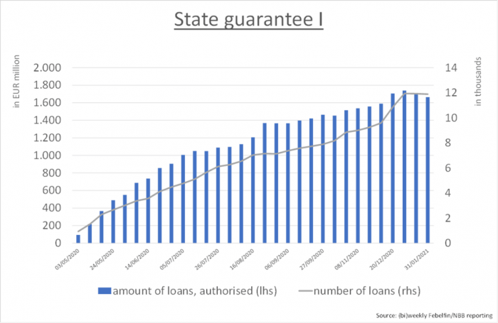 - Staatswaarborg-regeling 1: Deze garantieregeling is afgelopen, er werd voor 1,739 miljard euro (per 3/01/2021) gebruik van gemaakt (toegekende bedragen). Dit uitstaande bedrag zal nu geleidelijk dalen, gezien deze kredieten geleidelijk aan op eindvervaldag komen. Deze garantieregeling kon worden gebruikt voor kredieten aan alle ondernemingen, voor een maximale looptijd van 1 jaar.