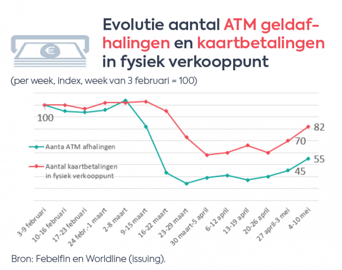 Doordat een heel aantal winkels tot voor kort gesloten waren door de coronacrisis daalde het totale aantal kaartbetalingen in een fysiek verkooppunt gedurende enkele weken. De daling van het aantal geldafhalingen zette zich echter nog sterker door. De laatste weken stijgen zowel de kaartbetalingen als de geldafafhalingen opnieuw maar de kaartbetalingen behouden hun voorsprong.