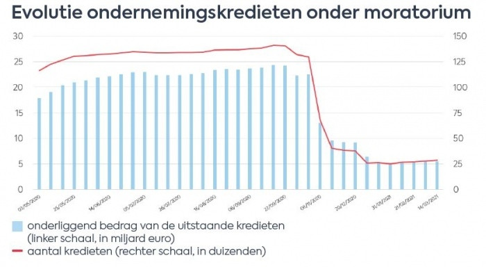De banken blijven betalingsuitstel voor kredieten toekennen aan bedrijven. Alle gezonde, levensvatbare bedrijven die reeds 9 maanden uitstel van betaling hebben gekregen, kunnen nog tot 30 juni 2021 een uitstel van terugbetaling aanvragen. Zo kunnen hun liquiditeitsnoden als gevolg van de coronacrisis deels worden opgevangen.