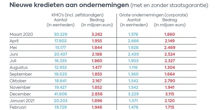 Wat het aantal kmo’s – inclusief zelfstandigen – betreft, zien we dezelfde evolutie. Op een paar uitschieters van vorig jaar na (maart, juni en december), ligt ook hier het aantal en het onderliggende bedrag in dezelfde lijn: 19.729 bedrijven kregen in februari 2021 een krediet, voor een totale onderliggende waarde van 1,95 miljard euro. Dit toont aan dat de banken, ondanks de moeilijke economische periode, hun maatschappelijke rol blijven spelen en de bedrijven kredieten blijven verlenen.