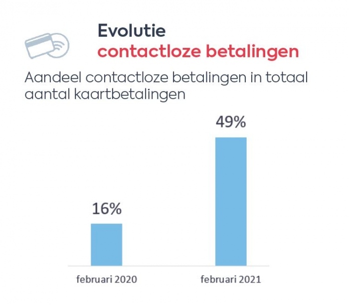 Bij het contactloos betalen blijft de stijgende trend onmiskenbaar: bijna de helft (49%) van alle kaartbetalingen gebeurt contactloos. Dat is een stijging van 7 procentpunt sinds december en een verdrievoudiging sinds februari 2020 (16%).