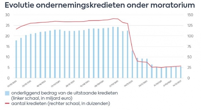 Het totale aantal uitstaande betalingsuitstellen bedroeg eind maart iets meer dan de maand voordien: 28 474 in maart tegenover 27 141 eind februari. Op het hoogtepunt van vorig jaar – in september 2020 – bedroeg dit aantal 141 000. Het totale onderliggend bedrag bedroeg toen 24,3 miljard euro, nu staat de teller op 5,7 miljard. 200 000 euro is het gemiddeld uitstaand bedrag per toegekend krediet.