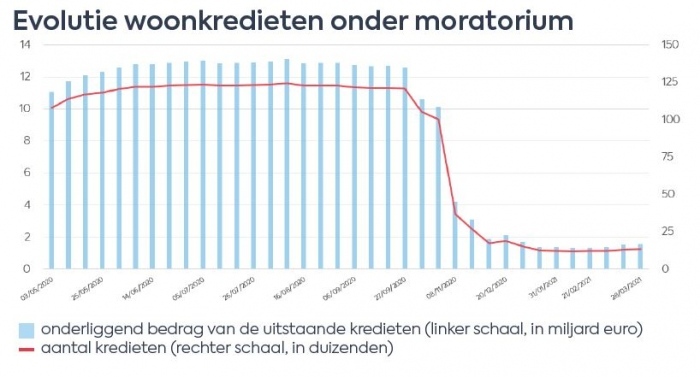 Sinds het hoogtepunt in augustus 2020 is het totaal aantal uitstaande betalingsuitstellen voor hypothecaire kredieten sterk gedaald: van 124.000 afgelopen zomer, naar 13.383 eind maart dit jaar. Tijdens de maand maart is dit aantal licht gestegen in vergelijking met januari (12 467) en februari (12 017). Het totale onderliggende bedrag (1,6 miljard euro) en het gemiddeld uitstaand bedrag (117 000 euro) van het krediet met uitstel volgen dezelfde evolutie: een quasi decimering ten opzichte van deze zomer – toen was het onderliggende bedrag 13,1 miljard euro – en een lichte stijging in de maand maart.