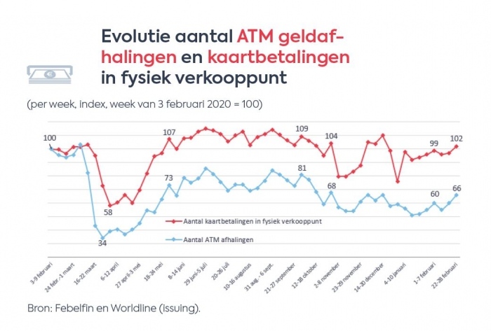 De grafiek toont aan dat de Belg tijdens de maand februari zijn kaart vaker heeft bovengehaald dan de weken voordien, en dat er nog steeds aanzienlijk minder cash geld wordt afgehaald.
