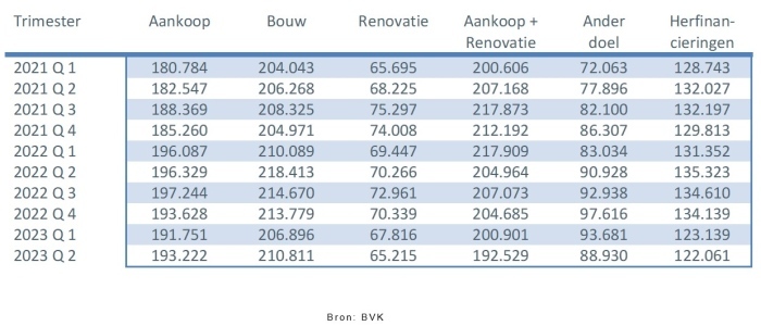 Hieronder vindt u de belangrijkste vaststellingen voor het tweede trimester van 2023 in vergelijking met het tweede trimester van 2022 (bij deze cijfers zijn de herfinancieringen buiten beschouwing gelaten):