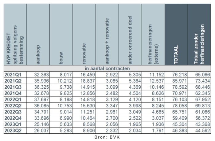 Het aantal kredietaanvragen daalde voor alle doeleinden. De kredietaanvragen voor de aankoop van een woning (-13.184) daalden met -22,7%, deze voor de aankoop + renovatie van een woning (-524) met -10%. Ook het aantal kredietaanvragen voor de renovatie van een woning (-6.027, hetzij -34,8%), evenals het aantal kredietaanvragen voor andere doeleinden zoals een garage, bouwgrond... (-1.970, hetzij -38,8%) kenden een sterke daling, net als het aantal kredietaanvragen voor de bouw van een woning (-7.224, hetzij -52,7%). Ook het aantal aanvragen voor externe herfinancieringen kende een spectaculaire daling met -63,5%, hetgeen niet verwonderlijk is in het huidige stijgende renteklimaat.