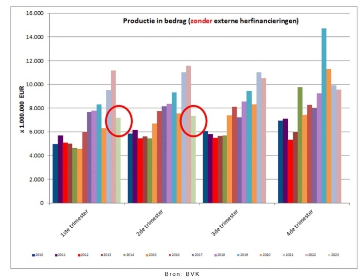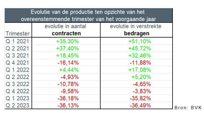 Er werden in het tweede trimester van 2023 iets meer dan 44.500 nieuwe kredieten verstrekt voor een totaalbedrag van bijna 7,4 miljard EUR – externe herfinancieringen buiten beschouwing gelaten. Dat is het laagste aantal kredieten verstrekt in een tweede trimester sinds bijna 20 jaar. In bedrag werd sinds 2015 in een tweede trimester nooit minder krediet verstrekt.