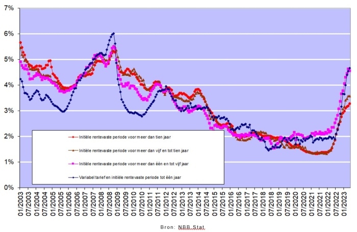 De rentevoeten voor hypothecaire kredieten kenden in het voorbije trimester verder een stijgende trend. Volgens cijfers gepubliceerd door de Nationale Bank van België bedroegen deze in mei tussen gemiddeld 4,66% (voor kredieten met een initiële periode van rentevastheid tot 1 jaar) en gemiddeld 3,28% (voor kredieten met een initiële rentevaste periode van meer dan 10 jaar).