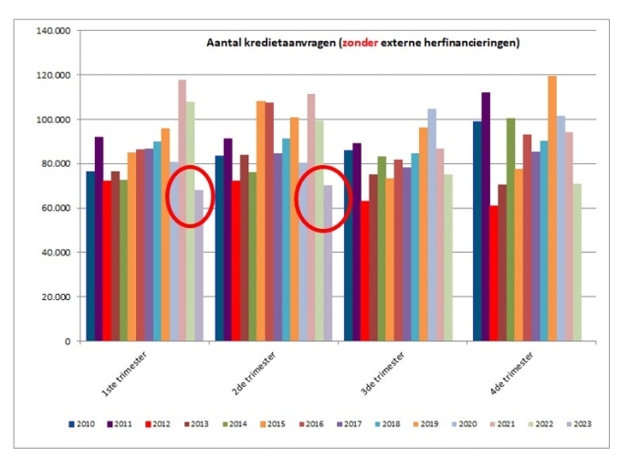 Het aantal kredietaanvragen, zonder deze die betrekking hadden op een externe herfinanciering, kende in de loop van het tweede trimester van 2023 een daling met ongeveer 29% ten opzichte van hetzelfde trimester van vorig jaar. Het onderliggende bedrag van de kredietaanvragen daalde eveneens met ongeveer 29%. Voor het tweede trimester op rij bevindt het aantal kredietaanvragen voor de betrokken trimesters (deze voor herfinancieringen niet meegerekend) zich op het laagste niveau sinds 2010.