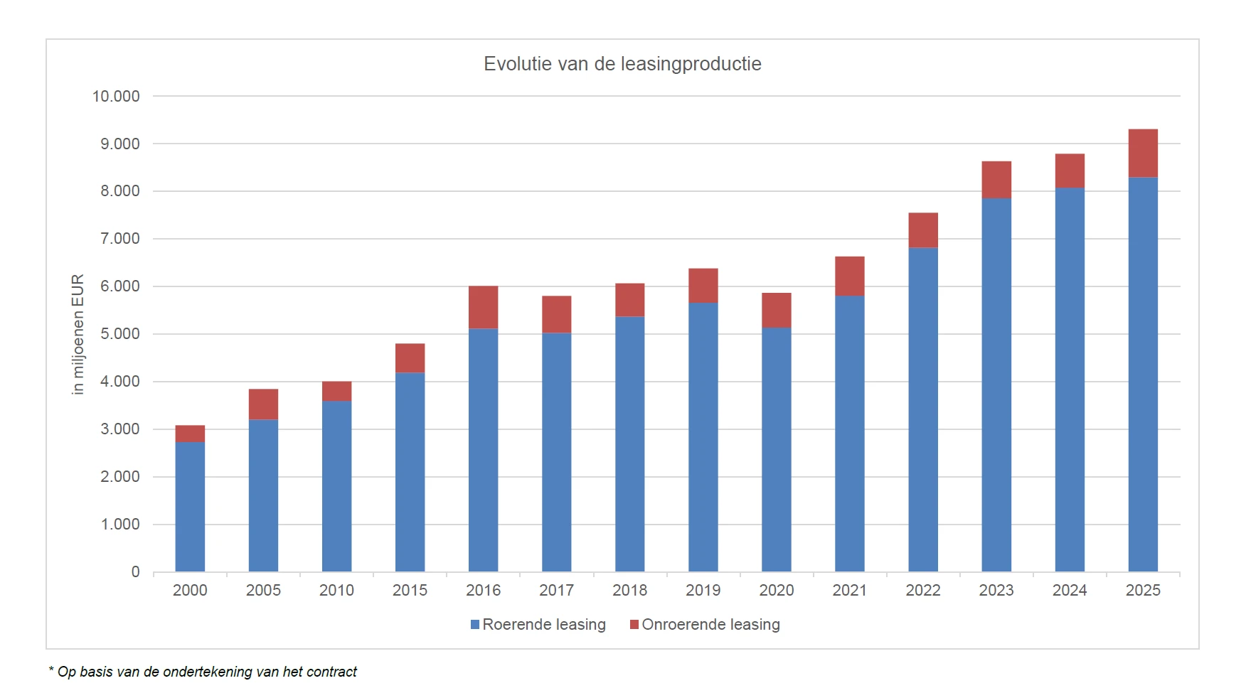 De positieve evolutie van de leasingmarkt weerspiegelt zich zowel in de productie als in het uitstaande volume. De totale productie (roerende en onroerende leasing) lag in 2025 6,0% hoger dan in 2024 en bedroeg 9,3 miljard EUR.