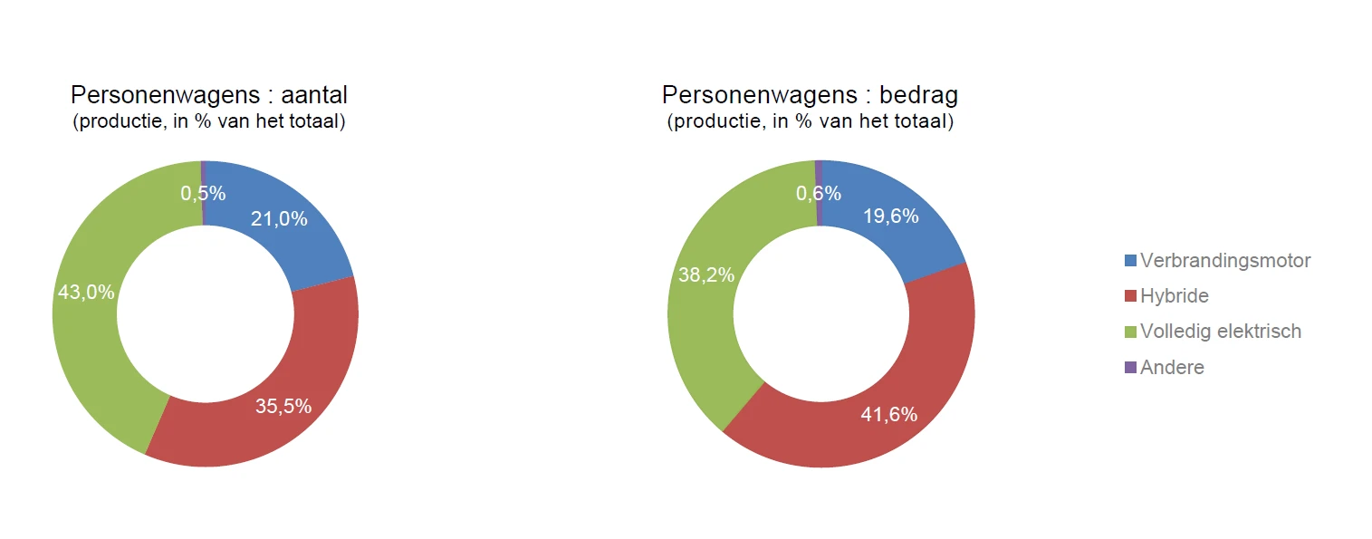 De leasingproductie van personenwagens liep daarentegen in 2025 met 1% terug. Twee factoren verklaren deze daling: enerzijds is er een tendens naar langere leasingtermijnen, en anderzijds werden in 2025 minder personenwagens ingeschreven dan in het jaar voordien. Van het totaal aantal geleasede nieuwe en tweedehandspersonenwagens had in 2025 21% een verbrandingsmotor. Hybride wagens vertegenwoordigden 35%, terwijl 43% van de geleasede personenwagens volledig elektrisch was. Elektrificatie blijft daarmee een belangrijk kenmerk van de leasingmarkt.