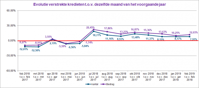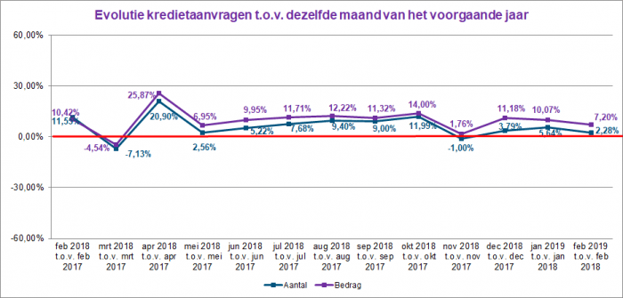 Het aantal kredietaanvragen steeg in februari 2019 met 2,3% ten opzichte van februari 2018. Het overeenstemmende totaalbedrag van deze aanvragen lag meer dan 7% hoger. In februari 2019 steeg het aantal verstrekte kredieten met bijna 8%. In bedrag is 12% meer krediet verleend dan in februari 2018.