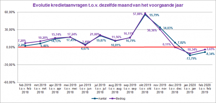 Het aantal kredietaanvragen daalde in februari 2020 met iets meer dan 8% ten opzichte van februari 2019. Het overeenstemmende totaalbedrag van deze aanvragen lag eveneens bijna 4% lager.