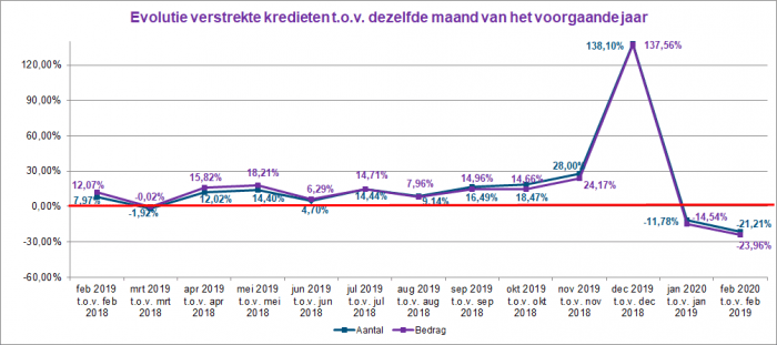 In februari 2020 daalde het aantal verstrekte kredieten met meer dan 21%. In bedrag is eveneens ongeveer 24% minder krediet verleend dan in februari 2019.