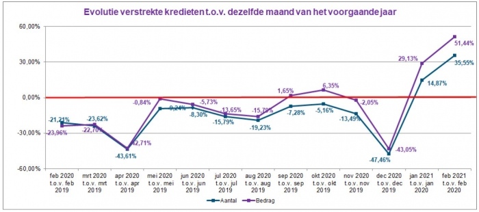 In februari 2021 steeg het aantal verstrekte kredieten met ongeveer 35,5%. In bedrag werd bijna 52,5% meer krediet verleend dan in februari 2020.