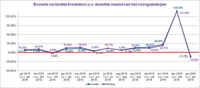 In januari 2020 daalde het aantal verstrekte kredieten met bijna 12%. In bedrag is eveneens ongeveer 14,5% minder krediet verleend dan in januari 2019.