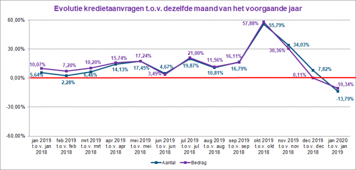 Het aantal kredietaanvragen daalde in januari 2020 met bijna 14% ten opzichte van januari 2019. Het overeenstemmende totaalbedrag van deze aanvragen lag eveneens meer dan 10% lager.