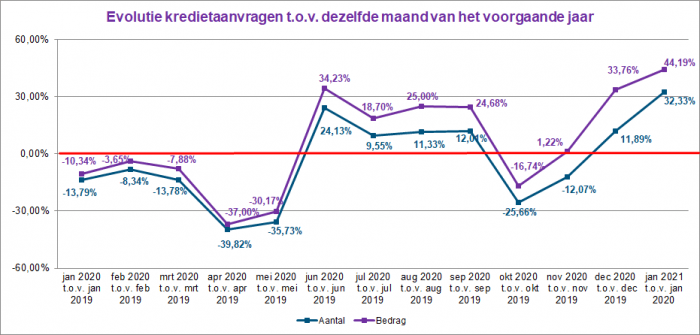 Het aantal kredietaanvragen steeg in januari 2021 met ongeveer 32% ten opzichte van januari 2020. Het overeenstemmende totaalbedrag van deze aanvragen lag zelfs iets meer dan 44% hoger.