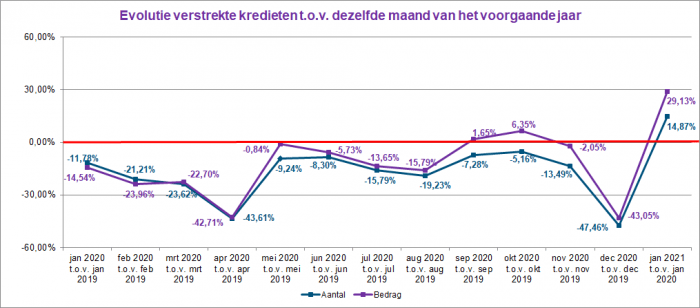 In januari 2021 steeg het aantal verstrekte kredieten met ongeveer 15%. In bedrag werd iets meer dan 29% meer krediet verleend dan in januari 2020.