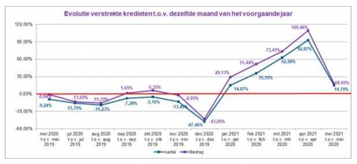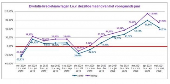 Het aantal kredietaanvragen steeg in mei 2021 met bijna 65% ten opzichte van mei 2020. Het overeenstemmende totaalbedrag van deze aanvragen lag zelfs bijna 81,5% hoger.