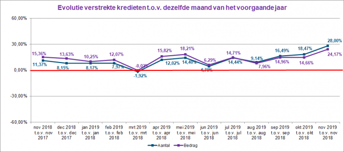 In november 2019 steeg het aantal verstrekte kredieten met 28%. In bedrag is eveneens iets meer dan 24% meer krediet verleend dan in november 2018. Ook dit is ongetwijfeld een gevolg van de aangekondigde afschaffing van de woonbonus in Vlaanderen.