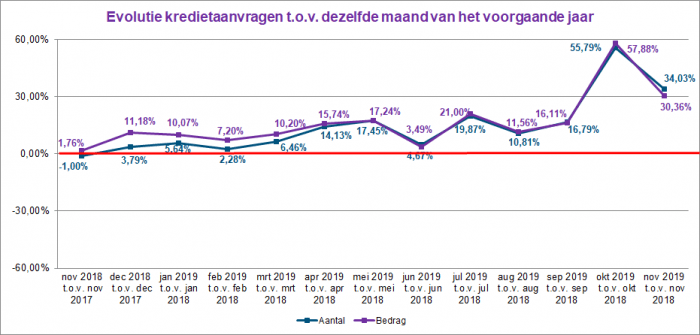In november 2019 steeg het aantal aanvragen voor een hypothecair krediet met 34% in vergelijking met november 2018. In bedrag was er eveneens een stijging met iets meer dan 30% ten opzichte van vorig jaar.