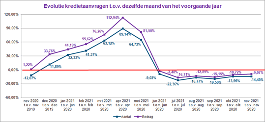 Het aantal kredietaanvragen daalde in november 2021 met ongeveer 14,5% ten opzichte van november 2020. Het overeenstemmende totaalbedrag van deze aanvragen lag 9% lager.