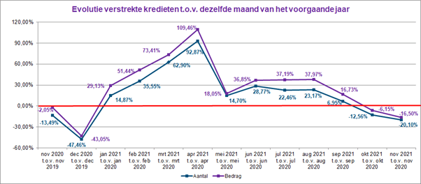 In november 2021 daalde ook het aantal verstrekte kredieten met ongeveer 20%. In bedrag werd 16,5% minder krediet verleend dan in november 2020.