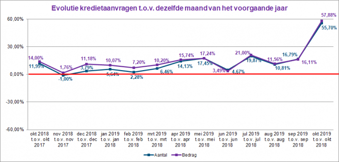 In oktober 2019 steeg het aantal aanvragen voor een hypothecair krediet met bijna 56% in vergelijking met oktober 2018. In bedrag was er eveneens een stijging met bijna 58% ten opzichte van vorig jaar.