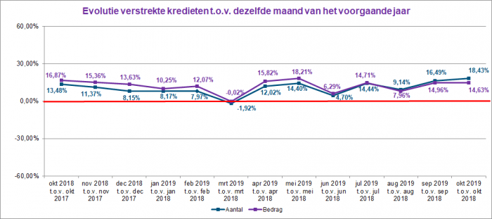 In oktober 2019 steeg het aantal verstrekte kredieten met bijna 18,5%. In bedrag is eveneens iets meer dan 14,5% meer krediet verleend dan in oktober 2018.