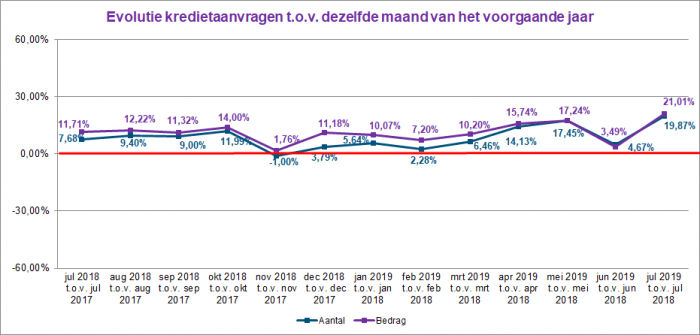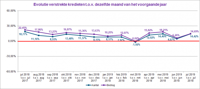 Het aantal kredietaanvragen steeg in juli 2019 met bijna 20% ten opzichte van juli 2018. Het overeenstemmende totaalbedrag van deze aanvragen lag eveneens 21% hoger. In juli 2019 steeg het aantal verstrekte kredieten met 14,5%. In bedrag is eveneens ongeveer 14,5% meer krediet verleend dan in juli 2018.