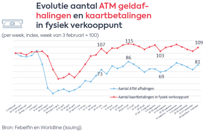 Onderstaande grafiek lijkt erop te wijzen dat de Belg ook vandaag nog steeds vaker de kaart bovenhaalt dan dat hij of zij cash betaalt. Het aantal kaartbetalingen op weekbasis ligt nu ongeveer 10% hoger vergeleken met februari (periode voor de lockdown). Het aantal ATM cashafhalingen daarentegen ligt beduidend lager (ongeveer 20%) dan het niveau van voor de lockdown.