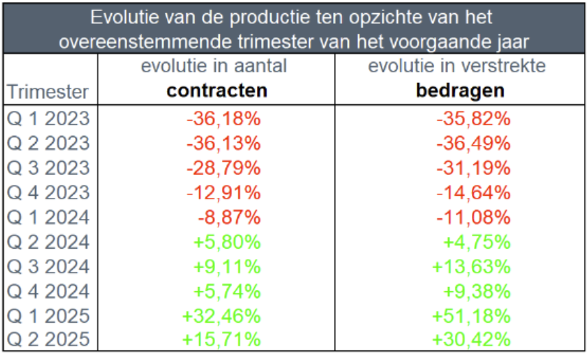 In het tweede kwartaal van 2025 is het aantal verstrekte kredieten, exclusief externe herfinanciering, met bijna 16% gestegen ten opzichte van het tweede kwartaal van 2024 en bevestigt de positieve trend over 5 opeenvolgende kwartalen. Ook het overeenkomstige bedrag steeg met ongeveer 30,5%.