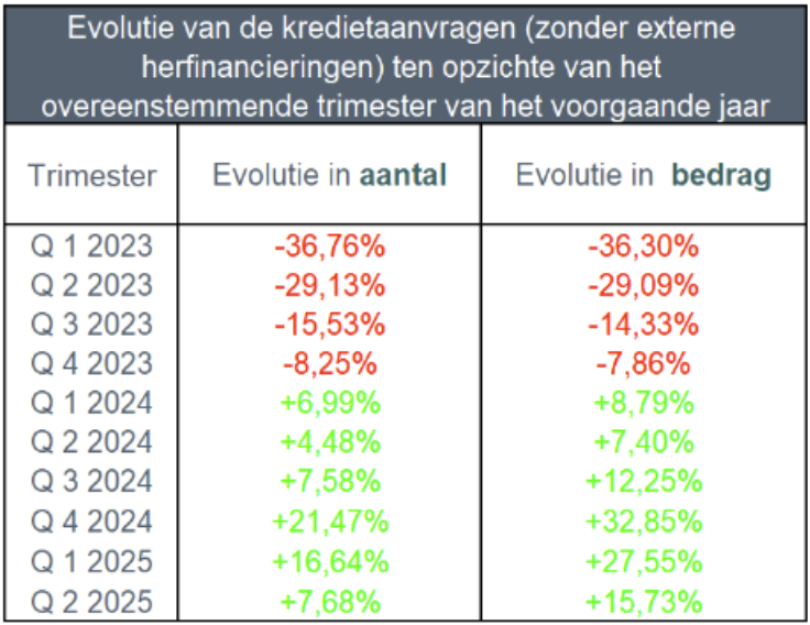 In het tweede kwartaal van 2025 is het aantal kredietaanvragen met ongeveer 7,7% gestegen in vergelijking met dezelfde periode vorig jaar, exclusief herfinancieringen. Ook het overeenkomstige aangevraagde bedrag steeg in het tweede kwartaal van 2025, met ongeveer 16%.