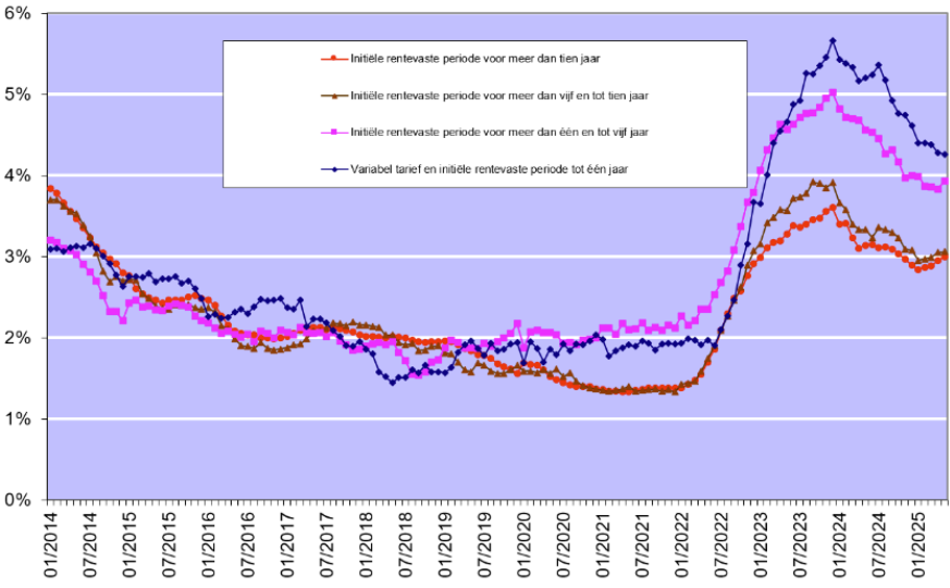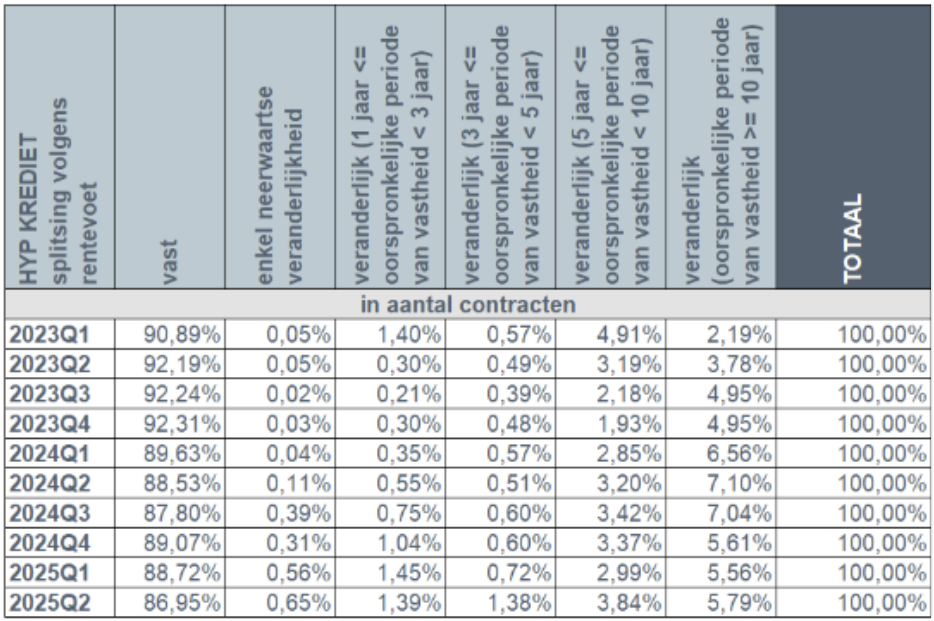 In het tweede kwartaal van 2025 kozen meer dan 9 op de 10 kredietnemers, meer bepaald 92,7%, opnieuw voor een vaste rente of een variabele rente met een initiële vaste renteperiode van minstens 10 jaar. Ongeveer 5,2% van de kredietnemers gaf de voorkeur aan een variabele rente met een initiële periode van vaste tarieven tussen 3 en 10 jaar. Iets meer dan 2% van de kredietnemers koos voor een jaarlijkse variabele rentevoet.