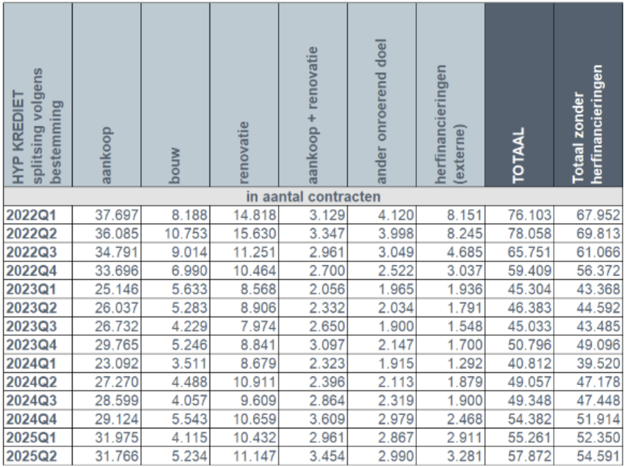 In vergelijking met het tweede kwartaal van 2024 kende het aantal renovatiekredieten (+236, of +2,2%) de kleinste stijging. Het aantal kredieten voor aankopen met renovatie (+1.058, of +44,2%) kende in het tweede kwartaal van 2025 de grootste stijging. Voor andere kredietdoeleinden is de trend positief, net als voor die in andere bestemmingen (+877, of +41,5%), evenals voor de bouw van een woning (+746, of +16,6%). Het aantal kredieten dat werd afgesloten voor de aankoop van een woning (+4.496, of +16,5%) bleef stijgen.